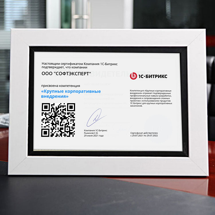 Наша компания получила сертификат, который подтверждает компетенцию «Крупные корпоративные внедрения» (ККВ). Это значит, что специалисты веб-интегратора «СофтЭксперт» имеют внушительный опыт по разработке и реализации сложных проектов.