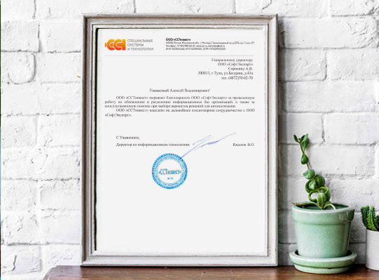 «ССТинвест» выражает благодарность ГК «СофтЭксперт» за проведенную работу по обновлению и разделению информационных баз организаций, а также за консультационную помощь при выборе вариантов решений для автоматизации.