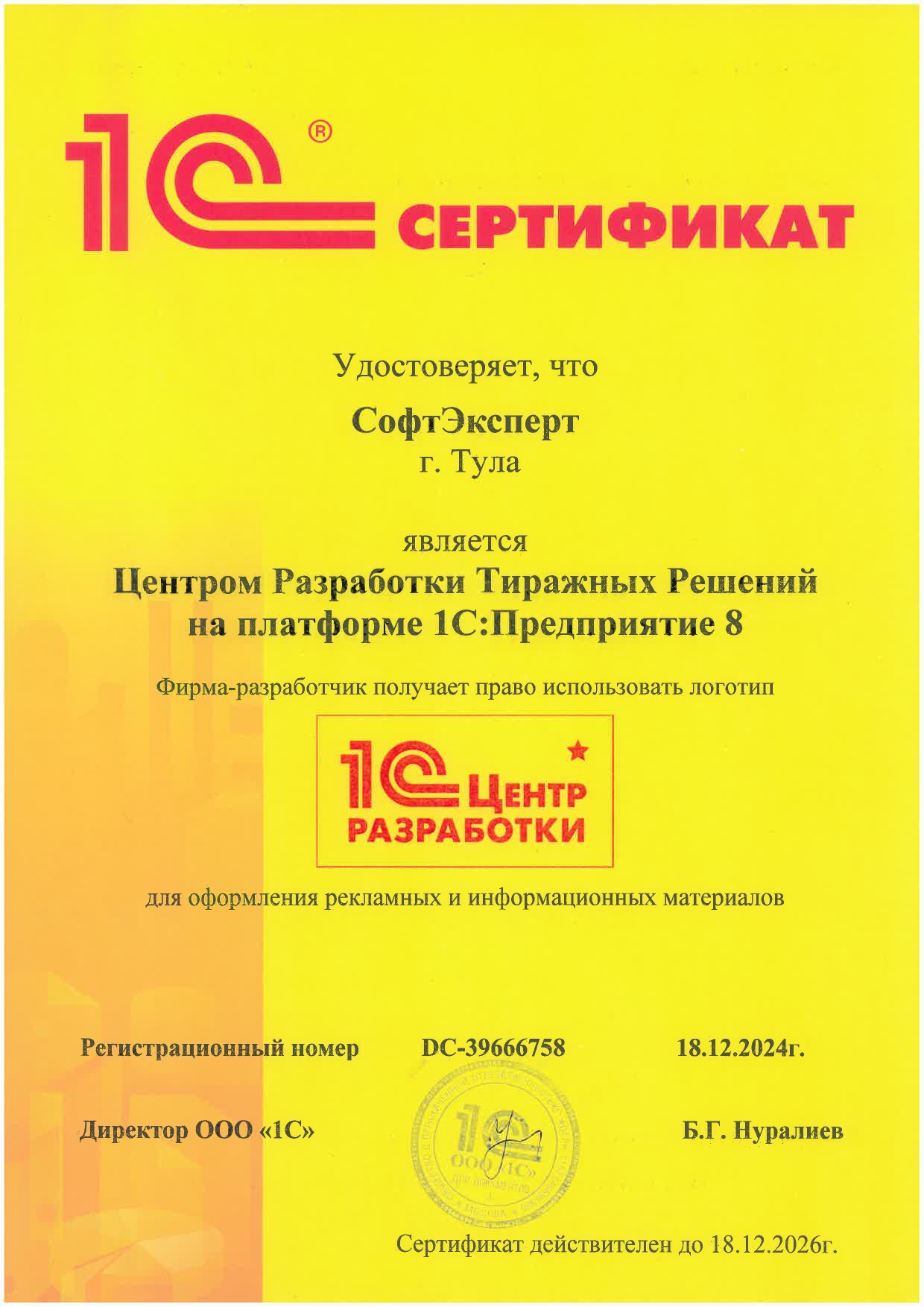 Одноименный сертификат подтверждает, что наша компания обладает необходимым уровнем компетенций для разработки, развития и сопровождения тиражных решений на платформе 1С: Предприятие.