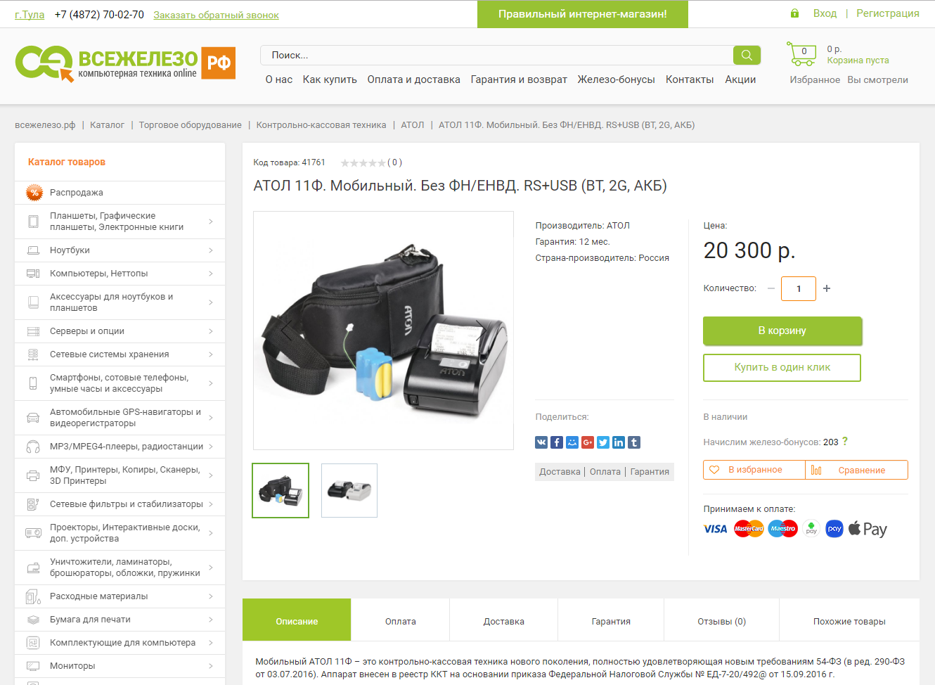 4. Настроены корзина и форма заказа товара в один клик. Для выполнения коммерческих операций в соответствии с требованиями 54-ФЗ подключена специальная онлайн-касса для интернет-магазина. Реализована поддержка программ лояльности — в частности, возможность внесения кода купона для получения скидки. Обеспечена возможность оплаты заказов наличными, безналичными, банковской картой (VISA, MasterCard, Maestro), Apple Pay и др.