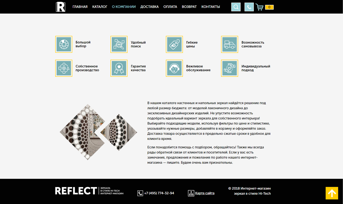 1. Отрисован лаконичный дизайн в чёрно-серо-голубых тонах. Минимализм, чёткая геометричность линий и «прохладная» цветовая палитра делают сайт идеальной подложкой для презентации зеркал в стиле хай-тек.