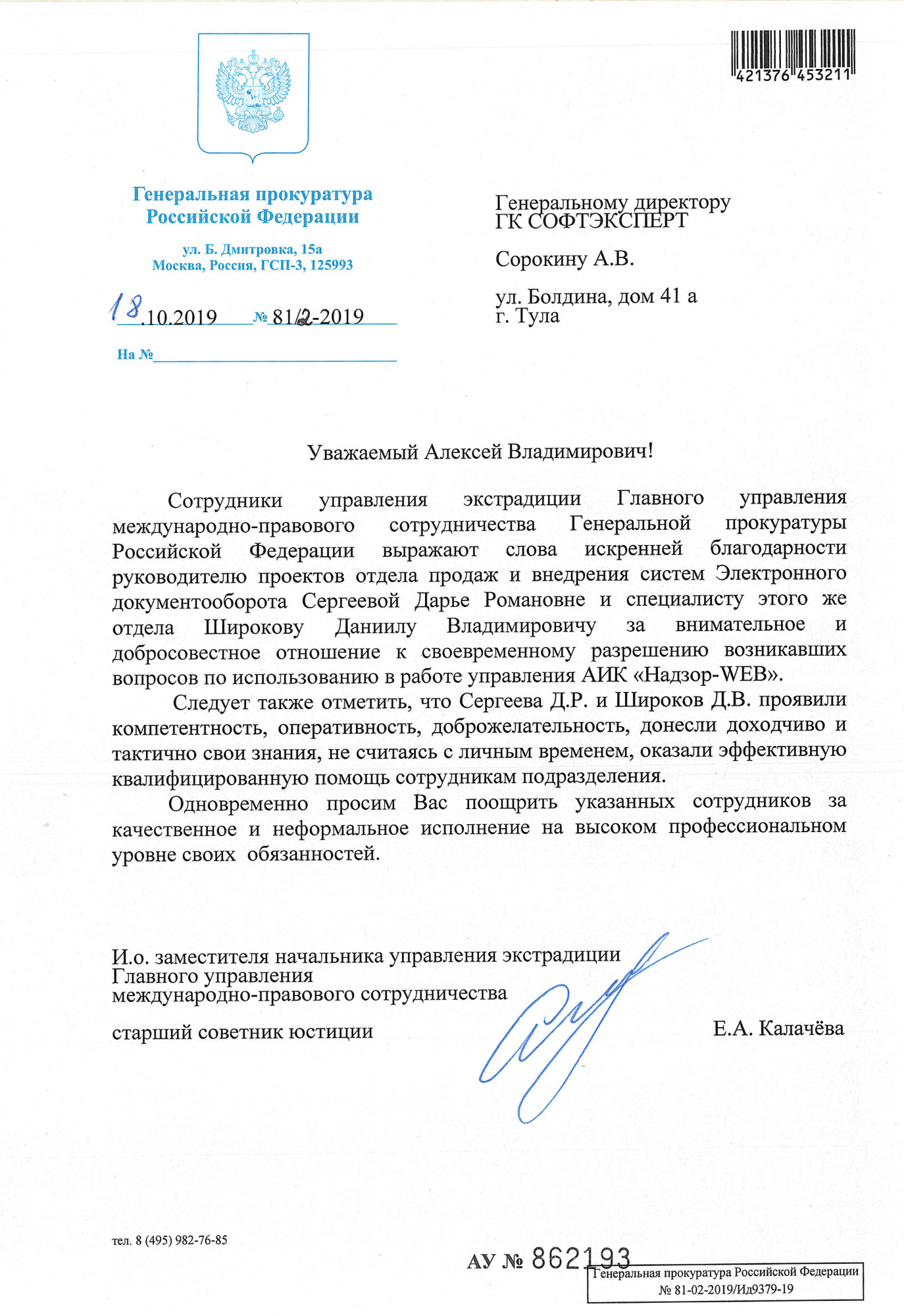 Работа специалистов отдела продаж и внедрения систем электронного документооборота «СофтЭксперт» Дарьи Сергеевой и Даниила Широкова отмечена благодарностью управления экстрадиции Главного управления международно-правового сотрудничества Генеральной прокуратуры Российской Федерации. Клиент особо отмечает компетентность, внимательное и добросовестное отношение к делу, проявленные сотрудниками при разрешении вопросов по эксплуатации автоматизированного информационного комплекса (АИК) «НАДЗОР-WEB».