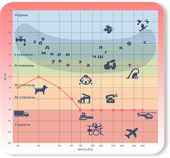 Уровень повреждения слуха пациента определяют с помощью аудиометра, данное исследование проводит слухопротезист, это позволяет исследовать как костную, так и воздушную проводимость. Результатом тестов является график слуховой чувствительности пациента к звуковым волнам, который называется аудиограммой.