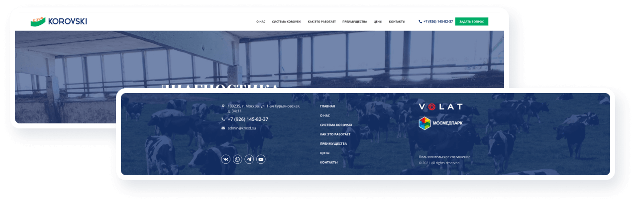 В процессе решили, что необходимо дополнительно кастомизировать шаблон под задачи клиента, поэтому разработали новый формат шапки с контактным телефоном и кнопкой, а также футер со ссылками на социальные сети и другие проекты компании: