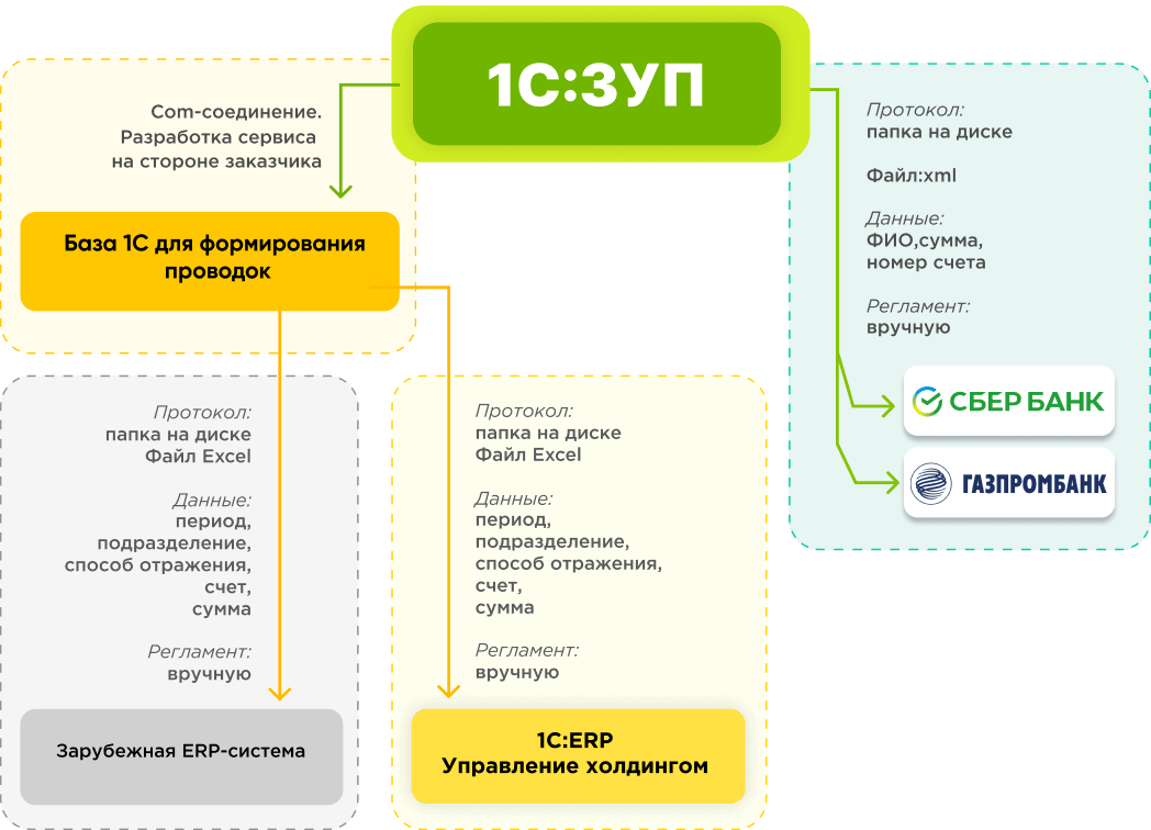 - Выстроить информационный обмен между «1С:ЗУП КОРП» и «1С:ERP Управление холдингом».