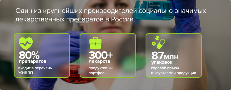Один из крупнейших производителей социально значимых лекарственных препаратов в России. В продуктовом портфеле – 300+ лекарств и 60+ фармсубстанций. Помимо производства и реализации медикаментов, бизнес клиента специализируется на разработке инновационных препаратов, медицинских испытаниях и выводе готовой продукции на отечественный рынок.