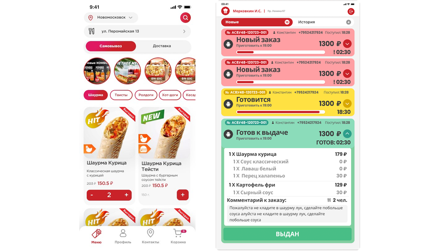 Клиентское приложение и приложение для поваровКлючевая идея заказчика состояла в том, что клиенты могут зайти в приложение, выбрать способ получения заказа (самовывоз или доставка), в случае с самовывозом выбрать удобную точку, сделать заказ, а также указать время его получения, совершить оплату и по необходимости оставить комментарий к заказу.