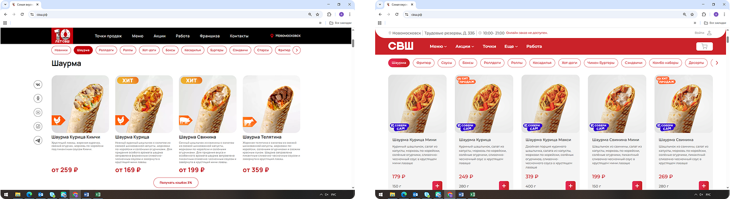 Самым значительным изменением стало добавление функции онлайн-заказа. Из-за этого поменялся механизм выбора точки продаж в конкретном городе, добавились кнопки для заказа через партнеров-агрегаторов, интеграция с картами для прокладки маршрута, а главное — добавились конструкторы для шаурмы и для комбо-наборов.