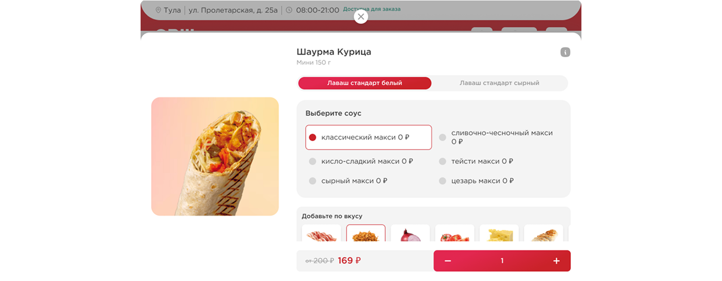 Дизайн конструктора на сайте всегда происходит в тесном взаимодействии с разработчиком и системным аналитиком. Мы учитываем возможные ограничения, определяем последовательность действий, а только после отрисовываем интерфейс. В кейсе СВШ ограничения конструктора заложены самим продуктом — шаурмой. Здесь есть переключатель для выбора лаваша, радио-кнопки для соуса и изменения рецепта, а также блок выбора дополнительного ингредиента. В последнем блоке как раз действуют естественные ограничения: размер лаваша стандартный, поэтому тут разработчик ограничил количество добавок до пяти, чтобы шаурму можно было свернуть.