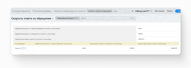 Для контроля работы менеджеров, проверки исполнения KPI и общей оценки эффективности обработки заявок создали отчет, в котором отображается имя менеджера, средняя скорость ответа на обращение в минутах.