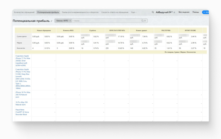 Настроить отчеты «Количество обращений», «Скорость ответа на обращение», «Потенциальная прибыль», «Темпы роста маржинальности и оборотов», «Количество денег в устройствах в наличии».