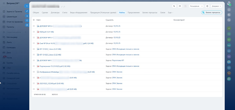 Консолидация файловМы доработали карточку компании, добавив вкладку «Файлы». В ней автоматически собирается все, что когда-либо было связано клиентом: из чатов, комментариев в задачах, прикрепленные счета, ТЗ, договора. Похожий инструмент был в программе, которую ранее использовал заказчик. Менеджеры могут оставлять к файлам комментарии и быстро переходить в исходную карточку. Это решило проблему бесконечного поиска документов по всему порталу.