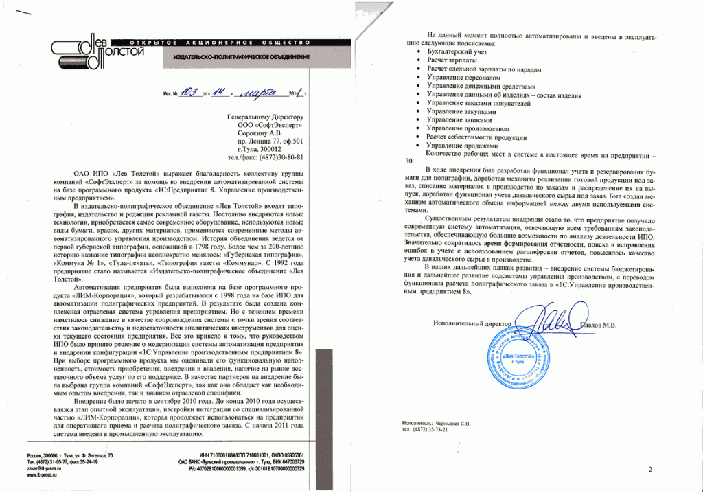Внедрение было начато в сентябре 2010 года. В ходе внедрения был разработан функционал учета и резервирования бумаги для полиграфии, доработан механизм реализации готовой продукции под заказ, списание материалов в производство по заказам и распределение их на выпуск, доработан функционал учета давальческого сырья под заказ. Был создан механизм автоматического обмена информацией между двумя используемыми системами. В декабре 2010 года система была переведена в режим опытной эксплуатации. С начала 2011 года система введена в промышленную эксплуатацию.
