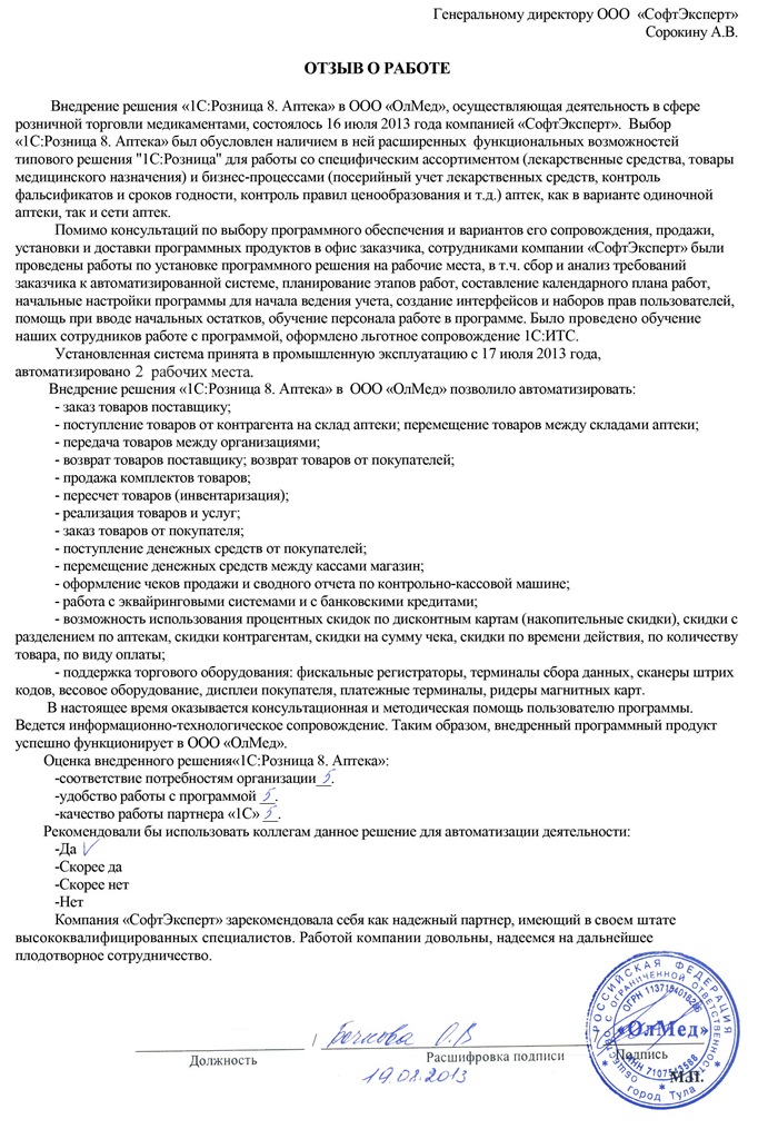 Внедрение решения «1С:Розница 8. Аптека» в ООО «ОлМед», осуществляющее деятельность в сфере розничной торговли медикаментами, состоялось 16 июля 2013 года компанией «СофтЭксперт». Выбор «1С:Розница 8. Аптека» был обусловлен наличием в ней расширенных функциональных возможностей типового решения "1С:Розница" для работы со специфическим ассортиментом (лекарственные средства, товары медицинского назначения) и бизнес-процессами (посерийный учет лекарственных средств, контроль фальсификатов и сроков годности, контроль правил ценообразования и т.д.) аптек, как в варианте одиночной аптеки, так и сети аптек.