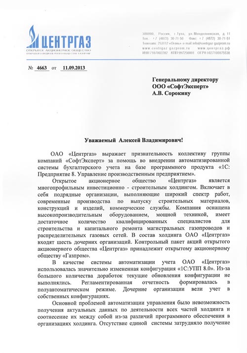Создание единой автоматизированной системы холдинга решило вопросы взаимодействия между организациями и анализа деятельности предприятия в целом. Консолидированная информация по всему холдингу позволяет эффективнее управлять ОАО «Центргаз» и контролировать дочерние организации.