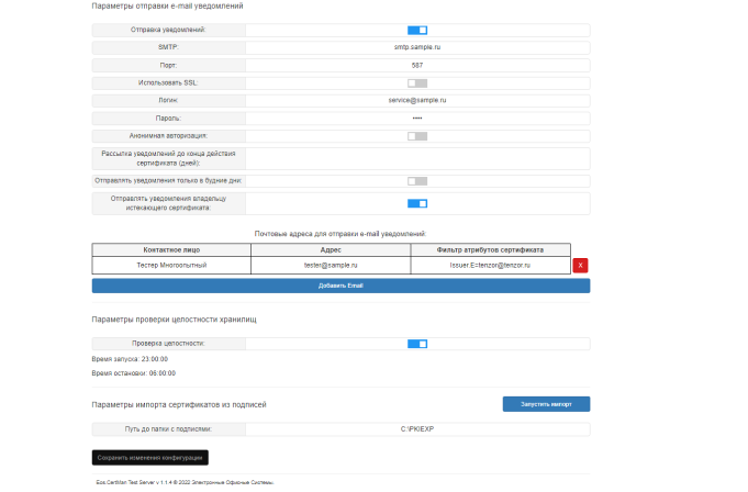 Отправка уведомлений на электронную почту об отзыве сертификата или окончании срока действия.